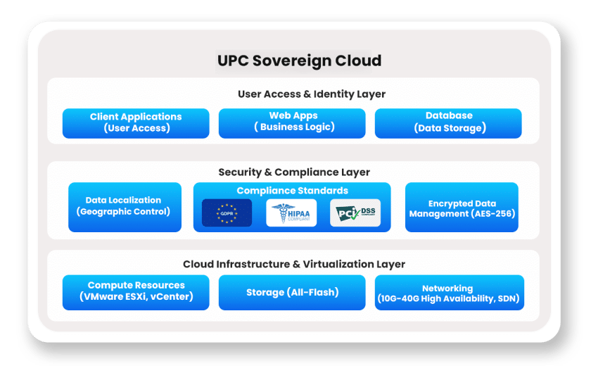 Our UPC Sovereign Cloud delivers a secure, high-performance cloud infrastructure tailored for government agencies, enterprises, and regulated industries that require data residency, sovereignty, and operational independence.